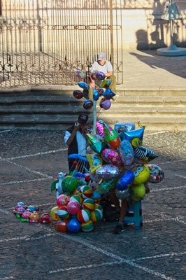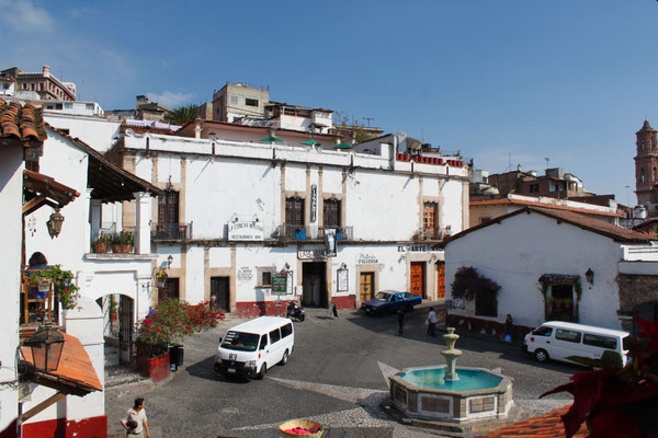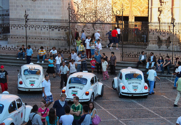 Von Balkon eines Cafes am Marktplatz haben wir den perfekten Blick auf das Treiben direkt unter uns... Und das Ganze sieht wirklich witzig aus - hat fast was von einem Kinderkarussel: Eine Kette von weißen Käfern (hin und wieder doch mal unterbrochen von einem kleinen Lieferwagen in einer anderen Farbe) dreht sich also den ganzen Tag im Kreis durch Taxco. Wenn ein Käfer anhält, weil ein Fahrgast aussteigen will, hält das ganze Karussel an und wenn der Käfer weiter fährt, fährt das ganze Karussel weiter... spannender Anblick! Die einzige Möglichkeit, mal aus der Kette auszuscheren, hat man hier auf dem Dorfplatz vor der großen Kirche, ansonsten drehen die weißen Käfer brav Runde um Runde um Runde...