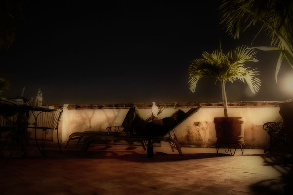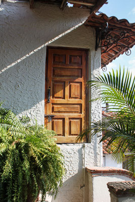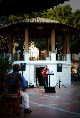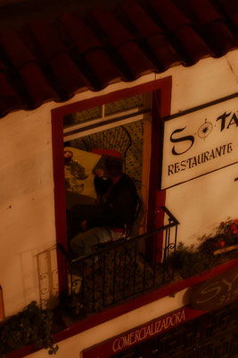 Fairerweise muss ich dazu sagen, dass mich der Autolärm, den diese weiße Blechlawine auf dem Kopfsteinpflaster den ganzen Tag veranstaltet am ersten Tag doch ziemlich stört; am zweiten Tag nehme ich ihn aber schon kaum noch wirklich wahr... Mal abgesehen davon, dass man viele der Gassen gar nicht mit dem Auto befahren kann, lohnt es sich übrigens sehr, das Auto stehen zu lassen und zu Fuß die (manchmal sehr steilen) kleinen Wege rechts und links durch die Altstadt zu erkunden, wo es dank fehlender Autos auch deutlich ruhiger ist... Oder auch entlang der Dorfstraße zu bummeln, von einem Schmucklädchen zum anderen zu schlendern und sich immer wieder einen schönen Platz zum Kaffee trinken oder Essen auszusuchen: Zum Beispiel am Marktplatz auf dem Balkon des Cafe "La Parroquia" oder an einem der schönen kleineren Plätze zum Guacamole essen auf einer winzigen Dachterrasse im "la Hamburguesa" oder zum Abendessen direkt hinter der Marktkirche auf der großen Dachterrasse des "Del Angel Inn" mit einem fantastischen Blick über die Stadt... Von der aus man übrigens auf die Dachterrasse unseres fantastischen Hotels guckt!