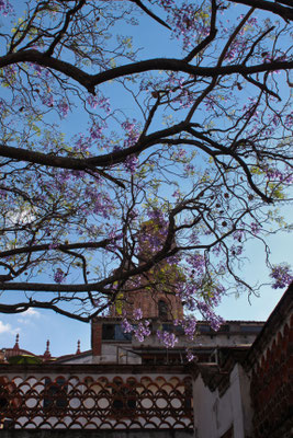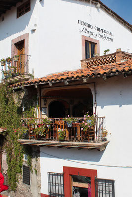 Taxco ist extrem in die beiden Berghänge ringsherum gebaut und wirkt mit seinen schönen weißen Häusern und den roten Ziegeldächern fast schon mediterran. Die Häuser sind alle einheitlich und es gibt nirgendwo Buntes oder Schrilles, was das Auge stören könnte... Auch große Supermärkte, Reklameschilder oder was man sonst noch so in einer Stadt erwartet, gibt es gar nicht; wie wir erfahren, steht die ganze Stadt unter Denkmalschutz! Stattdessen reihen sich hier Silberschmuckläden aneinander, die alle ganz offensichtlich von den einheimischen Familien hier mit viel Hingabe betrieben werden. Die Kirchen sehen aus wie aus Zuckerguss und jeder noch so kleine Platz wimmelt von (ebenfalls familienbetriebenen) Cafes und Restaurants, deren Balkone zur Straße rausgehen, sodass man schön sitzen und gucken kann. Eigentlich ist es fast egal, wo man sich hin setzt, denn da Taxco an zwei Berhängen liegt, hat man fast überall eine herrliche Aussicht auf das kleine malerische Städtchen mit seiner wunderbaren einladenenden Atmosphäre...
